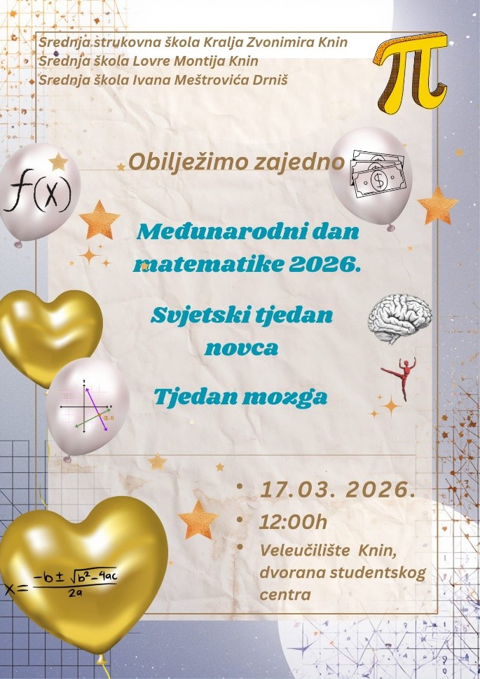 I ove godine u  suradnji sa Srednjom strukovnom školom Kralja Zvonimira iz Knina te Srednjom školom Ivana Meštrovića iz Drniša, 17. ožujka 2026. godine na Veleučilištu Marko Marulić u Kninu održano je svečano javno događanje kojim smo zajednički obilježili Međunarodni dan matematike, Svjetski tjedan novca i Tjedan mozga.